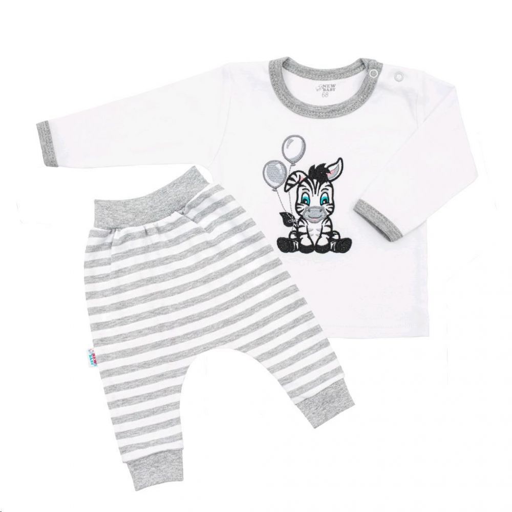 2-dílná kojenecká soupravička české značky New Baby Zebra exclusive pro miminka. Soupravička se skládá z trička a tepláčků. Tričko je jednobarevné s vyšitým obrázkem roztomilé zebry. Obrázek je z vnitřní strany podlepený podšívkou proti poškrábání. Okolo krčku, ručiček a pasu má šedý lem. Zapínání na cvočky na ramínku. Tepláčky jsou zdobeny moderními pruhy. V pase a na nohavičkách mají širší pružný lem. Složení: 100% bavlna.