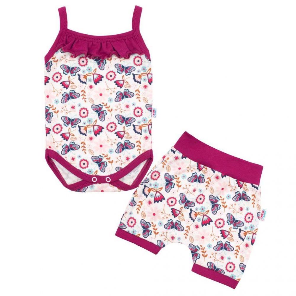 2-dílná holčičí soupravička české značky New Baby Little Girl. Součástí soupravičky jsou kraťasky a body bez rukávů. Body bez rukávů je celopotištěné krásným motýlkovo květinkovým vzorem s roztomilým volánkem. Praktické zapínání na cvočky mezi nožičkami. Na nohavičkách jsou užší pružné lemy a stylový, ale praktický střih dodává kraťaskům ten správný šmrnc. Naše letní soupravička z kolekce Little Girl je velmi praktická na horké letné dny. Složení: 100% bavlna.