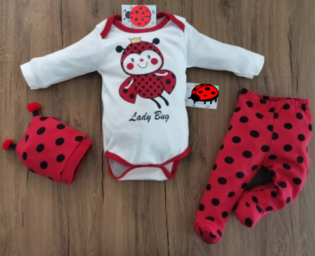 Každá novopečená maminka chce své dítě obléknout tak, aby bylo v bezpečí, teple a pohodlí. Navíc, když bude outfit vypadat krásně a roztomile, není co řešit. Kojenecká 3 dílná soupravička Beruška v bílo-červené barvě nesmí chybět ve výbavě novorozence. Soupravička je vyrobena z velmi příjemného, měkkého a kvalitního materiálu, který je vhodný pro miminka. Součástí sady je body s dlouhým rukávem, polodupačky a čepička. Dětské body zdobí potisk veselé berušky a nadpis. Zapínání na patentky mezi nohami usnadňují přebalování a převlékání miminka. Čepička je krásně tvarovaná, dobře drží na hlavičce miminka a nepadá. Čepičku zdobí dva tykadly. Je velmi praktická a netlačí na hlavičku miminka. Polodupačky a čepička v červené barvě s černými puntíky vypadá velmi krásně. Polodupačky mají elastický pas, který netlačí na bříško dítěte. Kojenecké polodupačky zahřejí citlivé chodidla dítěte a dokonale nahradí ponožky.