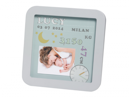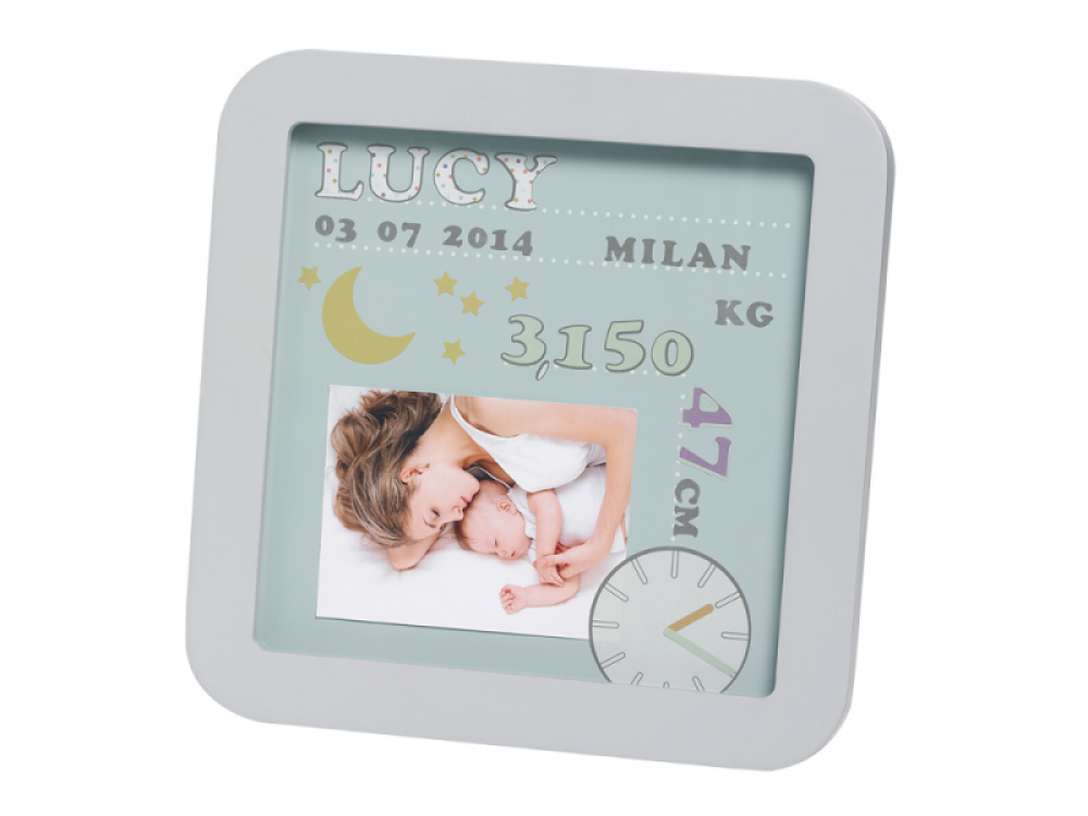 Stačí přidat vlastní fotografii a s pomocí dekorativních samolepek s čísly a písmeny sestavit jméno a datum narození vašeho miminka.
