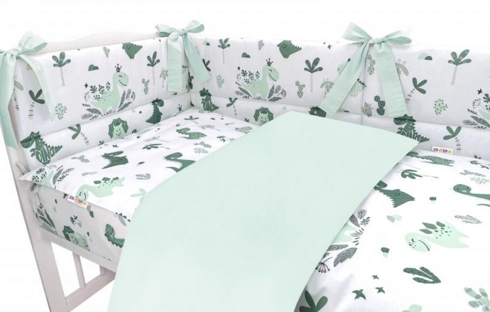 Recenze BABY NELLYS 3-dílná sada Mantinel s povlečením, Dino, mátová, 120x90