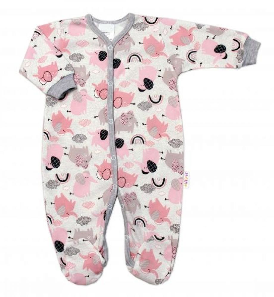 Baby Nellys Kojenecký bavlněný overálek, zapínání uprostřed, Sloníci, šedý lem, 56 (1-2m)
