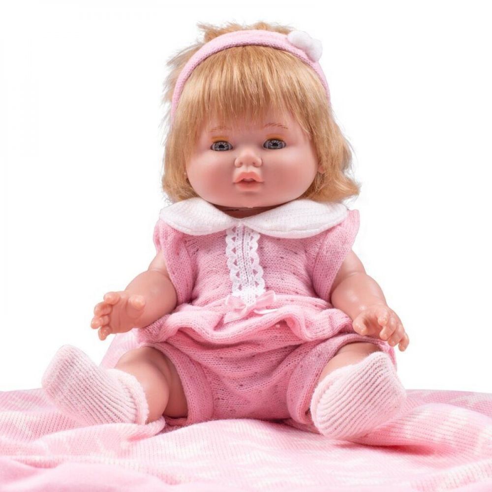 Luxusní španělská dětská panenka-miminko Berbesa Amalia. Panenka má vinylové tělíčko, ručičky i nožičky. Amalia má milou tvářičku, která vypadá jako opravdové miminko. Faldíky na ručičkách, nožičkách a bříšku ještě více připomínají novorozence. Panenka má krásná mrkací modrá kukadla, řasy, kvalitní vlásky s čelenkou, růžové rtíky, ručičky a nožičky jsou pohyblivé v kloubech. Součástí je roztomilá růžová dečka, ponožky, krásná halenka a krátké kalhoty. Obleček se dá sundat. Tělíčko miminka má jemnou vůni po vanilce. Délka panenky je cca 35 cm. Vhodné pro děti od 3 let. Při výrobě jsou používány výhradně kvalitní materiály.