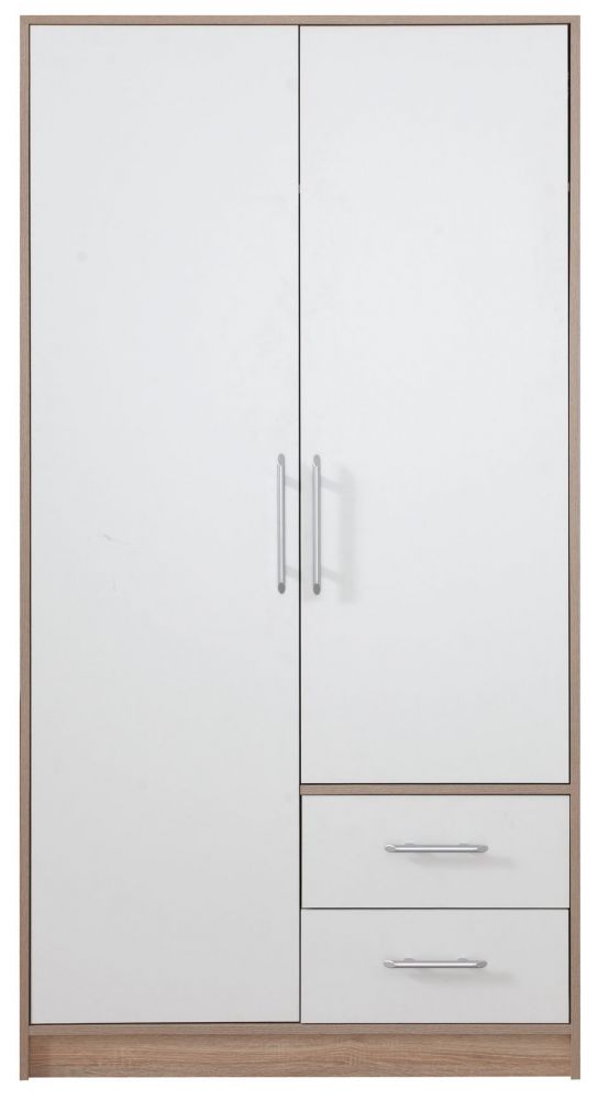 Uvnitř se nachází police a tyč na zavěšení. K dispozici jsou vám také 2 šuplíky ve spodní části. Šířka 100 cm, výška 190 cm, hloubka 56 cm. Barevné provedení: dub sonoma /bílá. K této skříni lze přikoupit nadstavbu 100 cm.