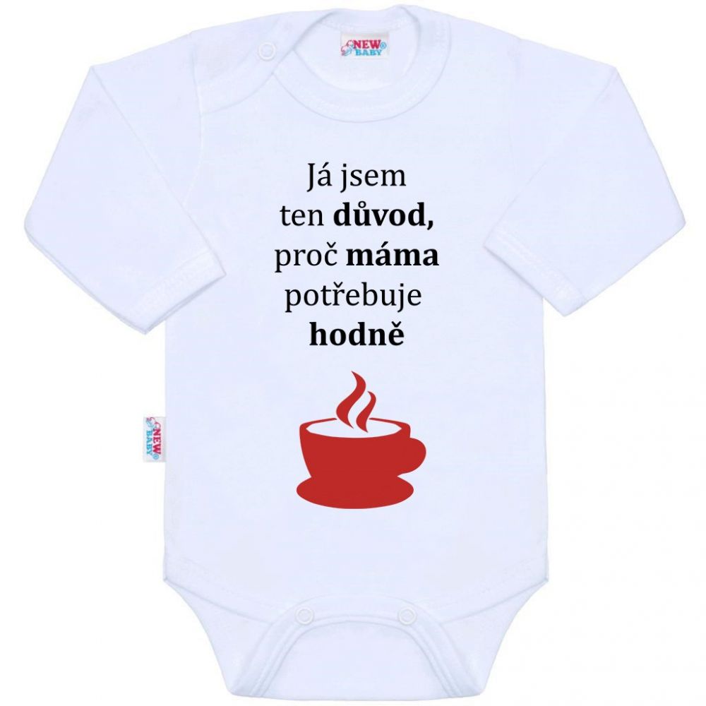 Originální bavlněné kojenecké body s dlouhým rukávem New Baby, s vtipným nápisem Já jsem ten důvod, proč máma potřebuje hodně kávy. Barvy použité k potisku jsou certifikované a vhodné pro miminka. Je vyrobeno z příjemného a kvalitního materiálu, ve kterém se bude Vaše miminko cítit příjemně. Body má zapínáni na cvočky na ramínku a mezi nožičkami, což usnadňuje oblékání a přebalování. Dopřejte Vašemu miminku vyniknout v originálním body. Složení: 100% bavlna. Rozměry: obvod kolem hrudníku cca 40 cm, délka rukávu cca 22 cm, celková délka cca 36 cm.Produkt české značky