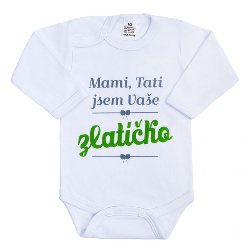 Originální bavlněné kojenecké body s dlouhým rukávem New Baby, s vtipným nápisem Mami, Tati jsem Vaše zlatíčko. Barvy použité k potisku jsou certifikované a vhodné pro miminka. Je vyrobeno z příjemného a kvalitního materiálu, ve kterém se bude Vaše miminko cítit příjemně. Body má zapínáni na cvočky na ramínku a mezi nožičkami, což usnadňuje oblékání a přebalování. Dopřejte Vašemu miminku vyniknout v originálním body. Složení: 100% bavlna. Rozměry: obvod kolem hrudníku cca 36 cm, délka rukávu cca 18 cm, celková délka cca 32 cm.Produkt české značky