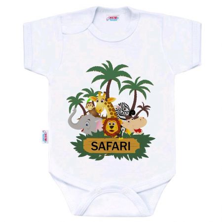 Originální bavlněné kojenecké body s krátkým rukávem New Baby s nápisem SAFARI a s obrázkem. Barvy použité k potisku jsou certifikované a vhodné pro miminka. Je vyrobeno z příjemného a kvalitního materiálu, ve kterém se bude Vaše miminko cítit příjemně. Body má zapínáni na cvočky na ramínku a mezi nožičkami, což usnadňuje oblékání a přebalování. Dopřejte Vašemu miminku vyniknout v originálním body. Složení: 100% bavlna.- Produkt české značky