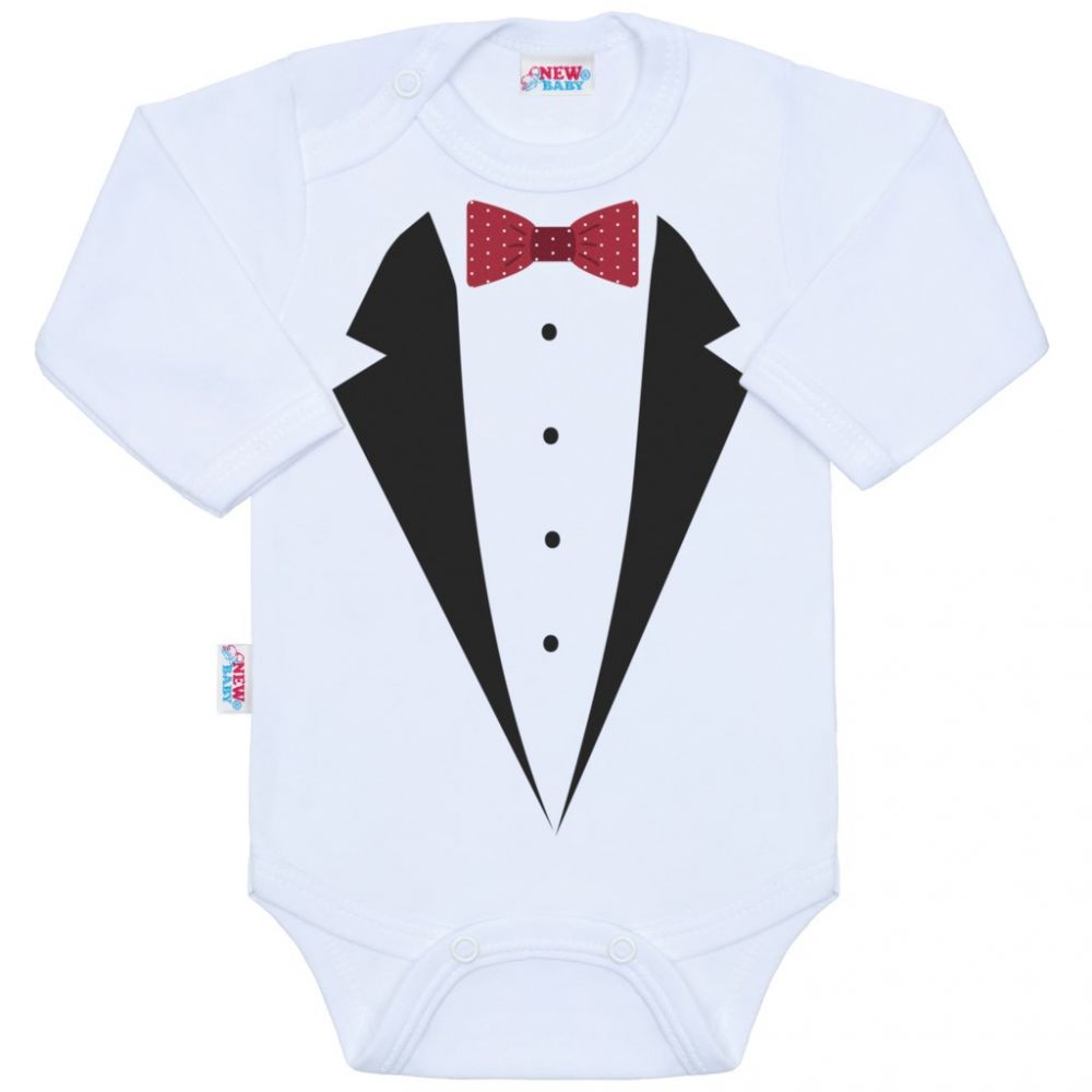 Originální bavlněné kojenecké body s dlouhým rukávem New Baby, s obrázkem smokingu. Barvy použité k potisku jsou certifikované a vhodné pro miminka. Je vyrobeno z příjemného a kvalitního materiálu, ve kterém se bude Vaše miminko cítit příjemně. Body má zapínáni na cvočky na ramínku a mezi nožičkami, což usnadňuje oblékání a přebalování. Dopřejte Vašemu miminku vyniknout v originálním body. Složení: 100% bavlna. Rozměry: obvod kolem hrudníku cca 36 cm, délka rukávu cca 18 cm, celková délka cca 32 cm.- Produkt české značky
