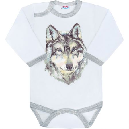 Originální bavlněné kojenecké body s dlouhým rukávem New Baby, s obrázkem hlavy vlka. Body má kolem krčku, nožiček a ručiček barevné lemování. Barvy použité k potisku jsou certifikované a vhodné pro miminka. Je vyrobeno z příjemného a kvalitního materiálu, ve kterém se bude Vaše miminko cítit příjemně. Body má zapínáni na cvočky na ramínku a mezi nožičkami, což usnadňuje oblékání a přebalování. Dopřejte Vašemu miminku vyniknout v originálním body. Složení: 100% bavlna. Rozměry: obvod kolem hrudníku cca 40 cm, délka rukávu cca 22 cm, celková délka cca 36 cm.- Produkt české značky