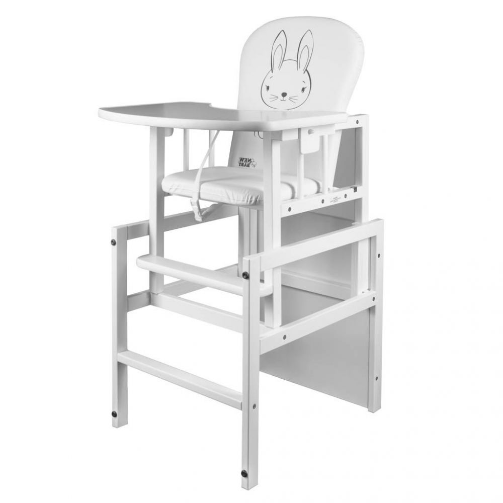 Multifunkční židlička české značky New Baby je vyrobena z kvalitního borovicového dřeva a zdobí ji veselý obrázek králíčka. Jídelní židličku lze rozložit a použít jako samostatný stůl se židličkou, což lze využít také během zábavy. Sedací část je pokryta barevným lehce omyvatelným materiálem, vyplněným molitanem, díky čemuž je židlička velice pohodlná. Veškeré materiály a suroviny používané při výrobě mají potřebné atesty nebo certifikáty, a proto je nábytek značky New Baby zcela bezpečný a odolný. Rozměry: - výška samostatné židličky 71 cm- židlička složená 102x53x45 cm- samotná židlička - šířka sedací části 36 cm, délka sedací části 28 cm, výška zádové opěrky 45 cm. - celková váha 11 Kg