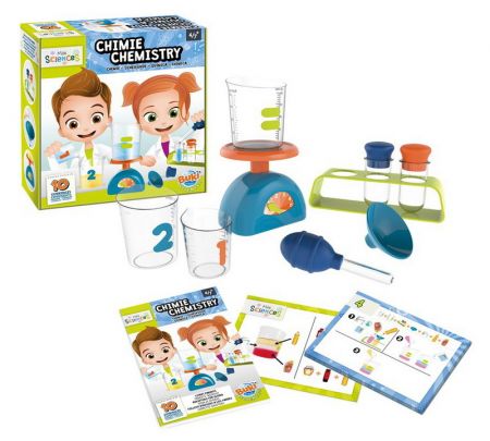 Chemická laboratoř ze série MiniScience je určena pro ty nejmenší badatele ve věku od 4 let. Jednotlivé pomůcky jsou dostatečně velké a jednoduché k použití. Součástí laboratoře je váha, kádinky, zkumavky se stojánkem, pipeta, trychtýř a 10 obrázkových karet s popsanými pokusy.