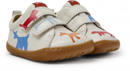 Bílé kožené boty pro děti s potiskem a prošívanou gumovou podrážkou (20% recyklace) a systémem zapínání na suchý zip.