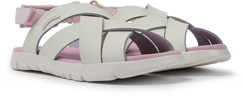 Bílé kožené dětské sandály s popruhem z recyklovaného PET a páskem na patě z kávové příze, systémem zapínání na suchý zip a podrážkou ze 100% EVA.
