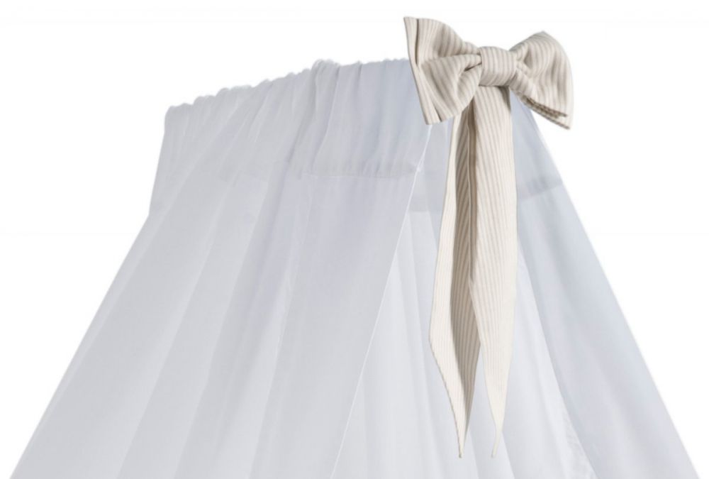 Krásný stojící nebesa do dětského pokoje. Vyrobeno z bílé saténové bavlny a zdobeno béžovou mašlí. Baldachýn je elegantní doplněk, díky kterému bude dětská postýlka útulnější a dítě se bude cítit bezpečněji.