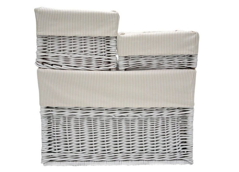 Bílé krabičky vyrobené z ručně pleteného polského proutí lakovaného v bílé barvě. Krásné béžové pruhované návleky z nich dělají nejen užitečný předmět pro odkládání hraček, ale také estetickou a dívčí dekoraci. Vnitřní část návleku je vyrobena z pevné textilie odolné vůči jakýmkoli těžkým hračkám nebo jiným předmětům.