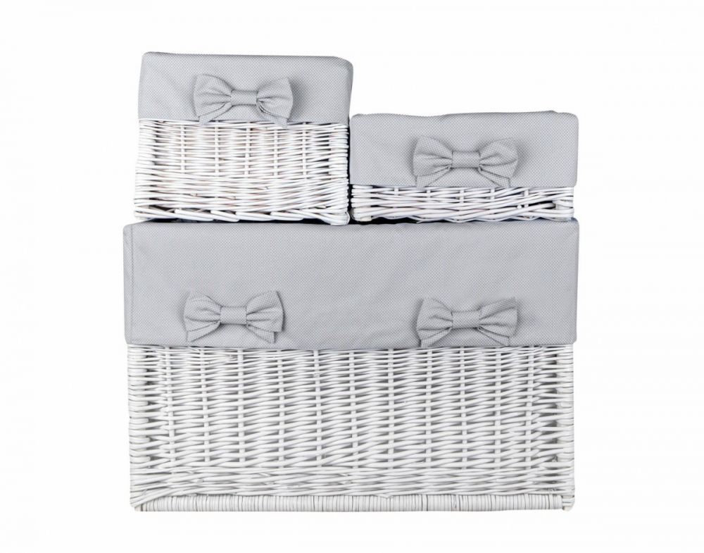 Bílé krabičky vyrobené z ručně pleteného polského proutí lakovaného v bílé barvě. Krásne šedé kockové vložky s mašličkami z nich dělají nejen užitečný předmět pro skladování, ale také estetickou výzdobu pro dívky i chlapce. Vnitřní část vložky je vyrobena z pevné textilie odolné vůči jakýmkoli těžkým hračkám nebo jiným předmětům.