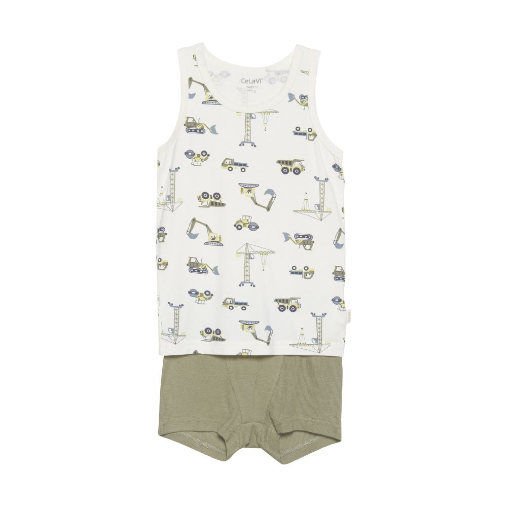 Pěkný set spodního prádla CeLaVi s tílkem s celoplošným potiskem a jednobarevnými boxerkami. Tílko CeLaVi má široký žebrovaný okraj v oblasti paže a krku. Boxerky mají široký elastický okraj, který zajišťuje dobré a pohodlné nošení.