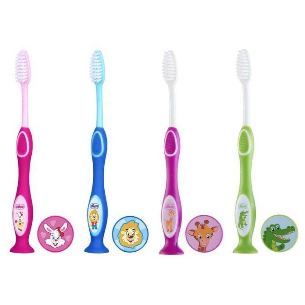 Miękkie włosie szczoteczki do zębów dla dzieci delikatnie usuwa osad nazębny, a tarka z drugiej strony główki skutecznie czyści język. Ergonomiczny kształt uchwytu i przyssawka sprawiają, że używanie szczoteczki jest wygodne i przyjemne. Osłonkę na włosie zdobią główki uroczych i zabawnych postaci. Codzienne mycie zębów szczoteczką dla dzieci Chicco to świetna zabawa!Szczoteczka dla dzieci do zębów mlecznych Chicco ma miękkie włosie o stożkowatym kształcie i delikatnych końcówkach, dzięki czemu idealnie nadaje się do kontaktu ze szkliwem i wrażliwymi dziąsłami dziecka. Po drugiej stronie główki szczoteczki znajduje się tarka do mycia języka, która w doskonały sposób uczy maluchy, że trzeba zadbać również i o tę część jamy ustnej.W szczoteczce do zębów mlecznych dla dzieci Chicco znajdziemy ergonomiczny, antypoślizgowy uchwyt, dzięki któremu dziecko może trzymać szczoteczkę pewnie i bezpiecznie w dłoni.Kształt szczoteczek dla dzieci do mlecznych zębów, ich wielkość i wybór materiałów użytych do produkcji to wynik ścisłej współpracy ze specjalistami z Chicco Baby Research Center.