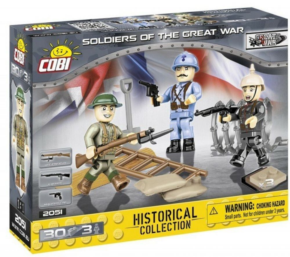 COBI - 3 figurky s doplňky 1. světová válka, 30 k, Věková kategorie: 5+ Tři figurky představující vojáků ze západní fronty první světové války. Voják v modré uniformě je Francouz s populární pistolí Mauser C96. Britský voják je vybaven novou dvoubarevnou puškou Lee-enfield s bajonetem. Německý voják byl vybaven puškou Mauser a charakteristickou helmou Pikelhaub. Sada obsahuje příslušenství jako: Příkopový žebřík, ostnatý drát, pytle s pískem, dřevěný trám a lopatu. Balení obsahuje 30 kostek.