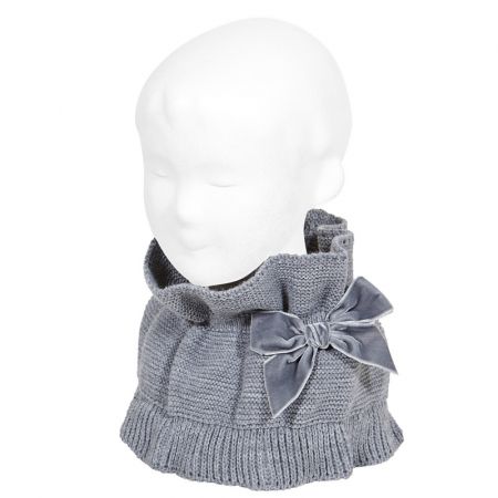 Stylový dětský dívčí pletený nákrčník. Velmi hezký detailní pletený vzor. Okraje lehce zřasené. Zdoben sametovou mašlí.