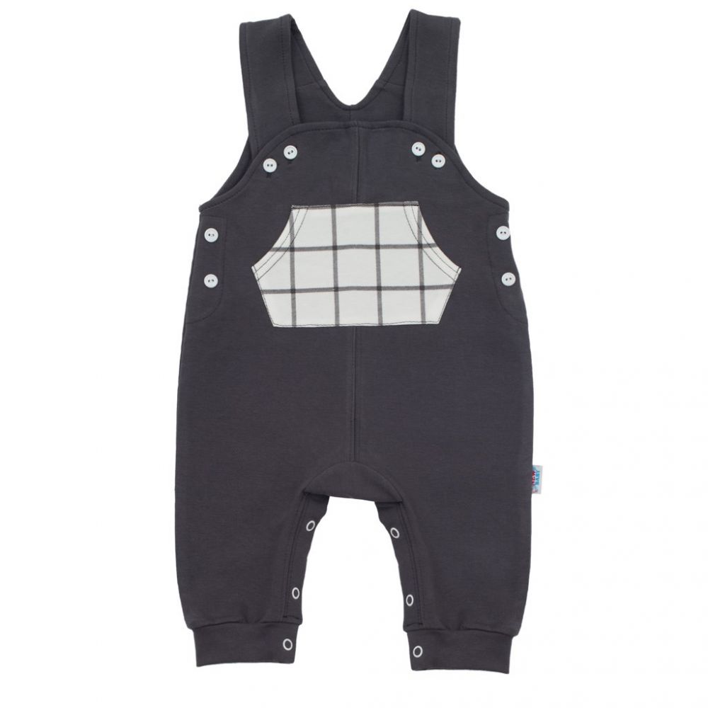 Bavlněné dětské lacláčky české značky New Baby Cool s moderním designem. Dětské lacláče mají na přední straně hlubokou kapsu a na nohavičkách mají pružný lem. Zapínají se na ramínkách na knoflíky a na cvočky mezi nožičkami, což je velmi praktické při oblékání. Složení: 95% bavlna, 5% elastan.