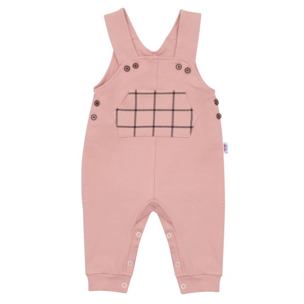Bavlněné dětské lacláčky české značky New Baby Cool s moderním designem. Dětské lacláče mají na přední straně hlubokou kapsu a na nohavičkách mají pružný lem. Zapínají se na ramínkách na knoflíky a na cvočky mezi nožičkami, což je velmi praktické při oblékání. Složení: 95% bavlna, 5% elastan.