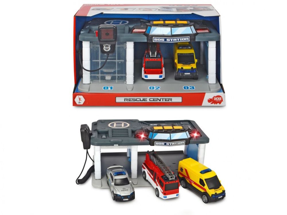 SOS záchranářská stanice se světlem, zvukem, funkčním mikrofonem a otevíracími vraty. Hasičké auto se žebříkem, policejní auto a ambulance - auta na volnoběh. Rozměry 31 x 22 x 16 cm.