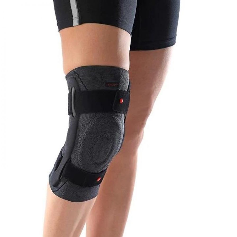 Kolenní ortéza s pevnými dlahami a nastavitelnými popruhy poskytuje boční podporu a stabilitu během pohybu, což pomáhá při každodenních aktivitách a sportu.
