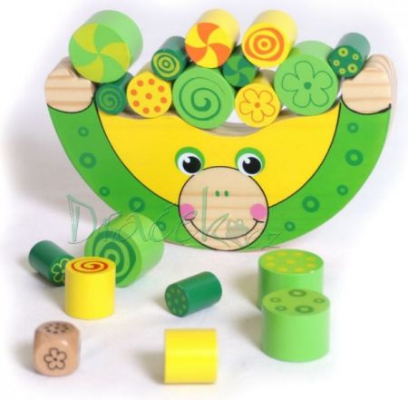 Ideální pomůcka pro procvičování jemné motoriky a logického úsudku. Dítě háže kostkou a podle toho, jaký symbol padne, musí doložit odpovídající váleček na žábu. Ta se ovšem nesmí překlopit. Vyrobeno z kvalitního masivu. Rozměry 16 x 15 cm.