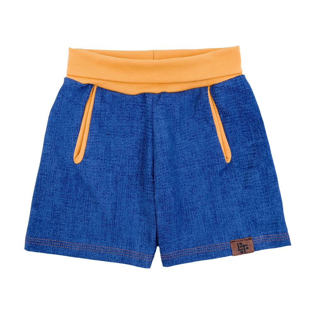 Dětské bavlněné kraťasy.Pohodlný střih - pružný lem v pase a volný střih nohavic jsou ideální pro letní pohodu.Kvalitní bavlna - příjemná na nošení, poddajná, vzdušná a pružná.Decentní design - džínově modrá klasika v kombinaci s hořčicovými detaily skvěle zapadne do letních šatníků.
