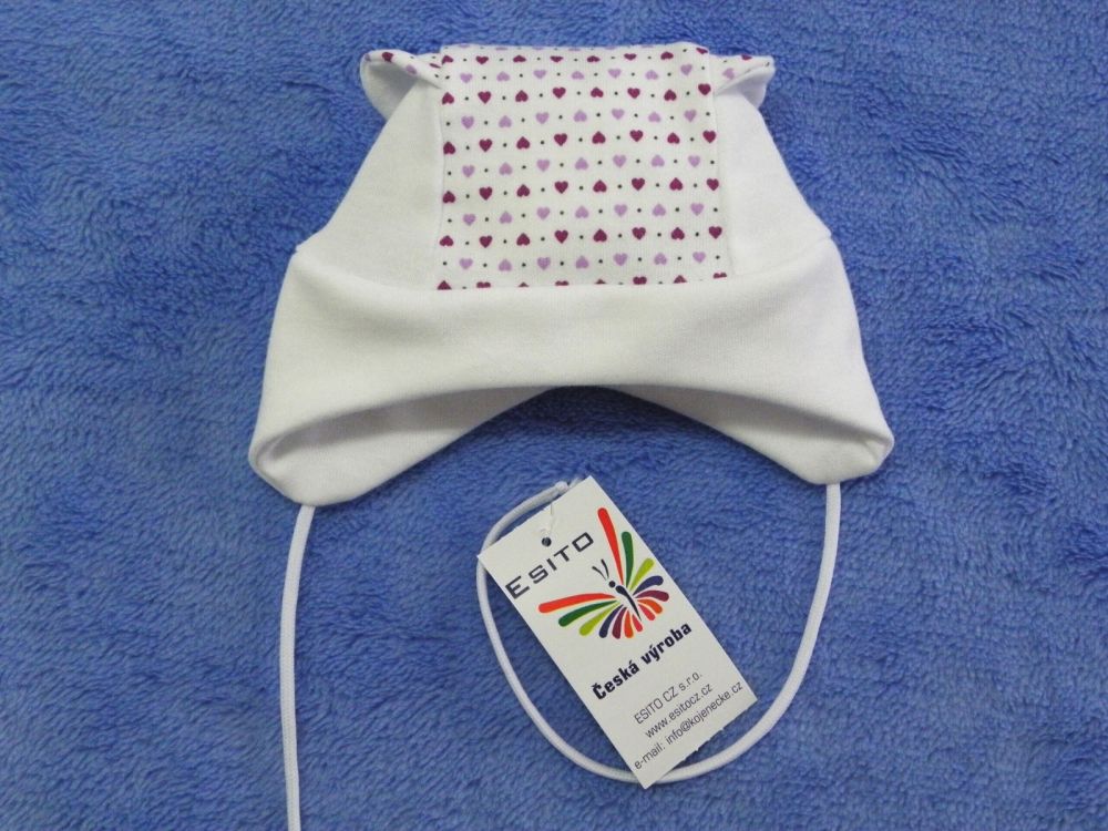 Kojenecká bavlněná čepička s oušky je lehčí čepička vhodná zejména do jarních a podzimních dní, lze ji však využít i během chladnějších letních dní. Použití: na zavazování pomocí šňůrkami - velmi dobře drží na hlavičce Materiál: 100% bavlněný úplet Jersey Velikosti: - XS pro věk 0-2 měsíce - S pro věk 3-5 měsíců