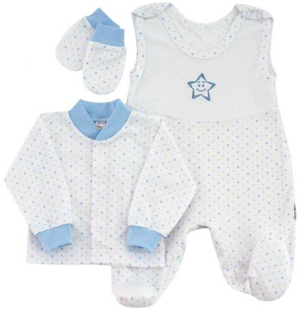 Popis: - třídílná souprava do porodnice - krásné provedení kojenecké soupravy do porodnice, vysoká kvalita výrobku a perfektní design výrobku - souprava obsahuje: * dupačky s výšivkou hvězdičky, od sedla dolů s potiskem * kabátek s potiskem hvězdiček * a rukavičky s potiskem hvězdiček Použití: - ideální jako základní souprava při odchodu z porodnice a nebo na oslavu jako sladěný komplet - vše co souprava obsahuje je zároveň v základní výbavičcce pro miminko takže oblečení využijete později i na běžné nošení Velikosti a rozměry: - 50, 56 a 62 - velikost určíte podle délky miminka v cm. Přičemž velikost se vybírá: velikost miminka do 50 cm = vel. 50, velikost miminka do 56 cm = velikost soupravy 56. Pokud si nejste jistí,vyberte vel. 56, máte jistotu, že tuto soupravu bude miminko nosit když ne hned tak později, jistě však nebude malá. Materiál: - dupačky, kabátek, rukavičky: 100% bavlněný úplet Jersey - velmi příjemný materiál - náplety okolo rukávů, nožiček a pasu: 96% bavlna + 4% elastan - patenty: ty nejkvalitnější patenty německé výroby, lakované - aby nedošlo ke styku pokožky s kovem Praní a žehlení: - dle etikety na výrobku - praní na 40°C - netřeba žehlit Záruka kvality: - veškeré oblečení pro miminka je navrženo, vyrobeno a zabaleno na území Česka - jedná se tedy o 100% český výrobek té nejvyšší kvality - samozřejmostí je dvouletá záruka - certifikace "Oeko-tex Standard 100" pro děti do 3 let Kvalitní český výrobek navržený, ušitý i balený s láskou k dětem v podhůří Orlických hor.