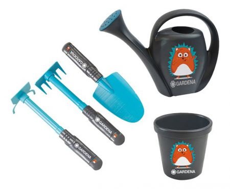 GARDENA startovací set "Ježek" obsahuje lopatu, hrabičky a motyčku. Nářadí má rozměr 17cm. Dále obsahuje květináč o rozměru 6 x 5cm, konývku o objemu 0,3l. Vhodné pro děti od 3 let.
