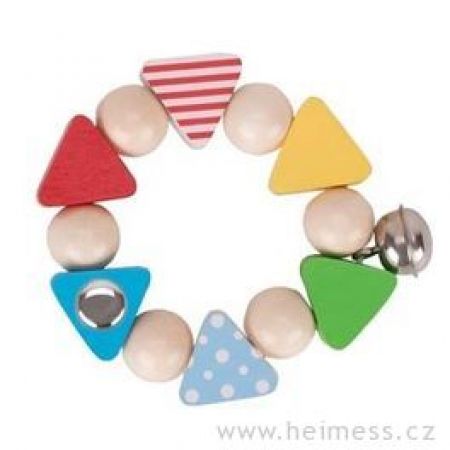 Přírodní kulaté perličky i zajímavé trojúhelníčky tvoří tento elastický kroužek. Pestré barvičky, puntíky, proužky, ale především blýskavé zrcátko zaujmou miminka. Chrastítko díky rolničce vydává příjemný cinkavý zvuk.