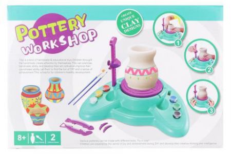 Hrnčířský kruh na baterie. Balení obsahuje hrnčířský kruh, 6 barev, 2 štětce, 2 modelovací špachtle, modelovací hmotu a další dopňky. Hrnčířský kruh na 3 x 1,5V AA baterie. Balení obsahuje hrnčířský kruh, 6 barev, 2 štětce, 2 modelovací špachtle, modelovací hmotu a další dopňky. Rozměr balení cca 36 x 24 x 8,5 cm. Věk 8+.