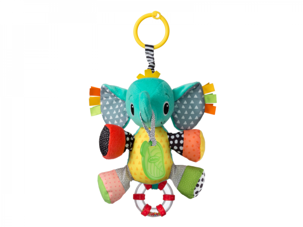 Různobarevný slon upoutá pozornost dítěte svými výraznými barvami i chrastěním při pohybu. Různorodé textury lákají dítě ke zkoumání. Kousátko pomáhá dítěti při prořezávání prvních zoubků. Hračku je možné zavěsit na autosedačku, kočárek či hrazdu na hrací dece. Vhodné pro děti od narození.