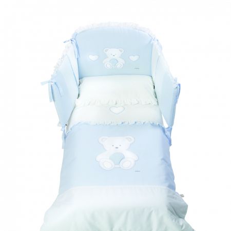 Souprava dětského ložního prádla a ochranného mantinelu s kvalitním bavlněným prostěradlom na matraci. Jemňoučký ochranný mantinel vytváří útočiště a chrání miminko před nárazy nebo zapadnutím nožičky a ručičky v postýlce.