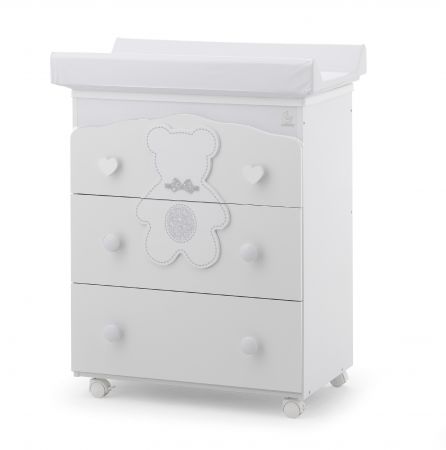 Praktický pult na přebalování a koupání miminka se 3 zásuvkami, do kterých vložíte všechny potřebné věci Vašeho miminka. Přebalovací pult na kolečkách s praktickou plastovou vaničkou uvnitř. K pultu si můžete dokoupit celou řadu doplňků ze stejné kolekce jako například dětskou postýlku, komodu nebo dětské povlečení a vytvořit tak dítěti pohádkový dětský pokoj.