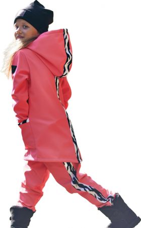 Softshellové kalhoty mají zespod fleece. Na nohavicích jsou ozdobné lampasy ze softshellu s motivem zebry. Kalhoty jsou vsazeny do pasového límce z černého žebrovaného úpletu, ve kterém je ještě guma. Nohavice jsou stažené do gumiček. Mají postranní kapsy a vzadu jednu šikmou kapsu. Dají se nosit na podzim, v zimě i na jaře.