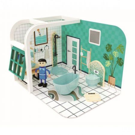 Hrací set Koupelna Sestavte si svůj vlastní domeček snů! Krásný nábytek s doplňky vdechující životu zábavu.Tento Jouéco hrací set - koupelna - byl navržen v souladu s nejvyššími standardy kvality. Nabízí neobvyklou kombinaci vysoce kvalitního dřeva, plastu a lepenky.- příslušenství: vana, WC, sprchový kout, umyvadlo s poličkou a zrcadlem, váha, otevírací okno, pohyblivý panáček- krásný interiérový design- rozměr: 25cm x 18cm x 18cm - skvělé jako dárek- dokoupením dalších místností můžete sestavit celý dům: nabídka Jouéco zahrnuje také obývací pokoj, kuchyň a ložnici- vhodné pro děti od 36 měsíců