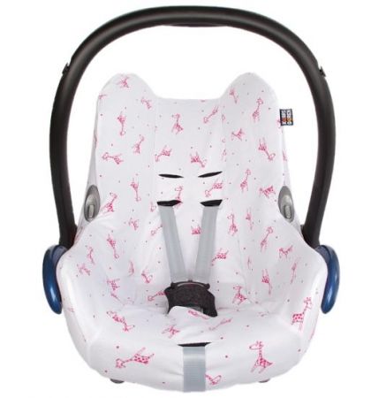 Bio-bavlněný potah bílý s motivem červených žiraf na dětskou autosedačku Maxi-Cosi CabrioFix, velikosti 0+. Potah vyrábí firma Kaarsgaren v České republice ze 100% bio-bavlny, lze jej prát v pračce na 40 °C.