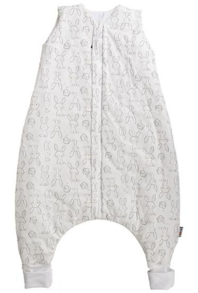 Dětský spací pytel s otvory pro nohy ve smetanové barvě a s motivem zajíčků, dítě v něm může volně kopat nožičkami. Délka spacího pytle je cca 90 cm, to je výška dítěte k ramenům. Lze jej prát v pračce při 30 °C. Spací pytel má uprostřed zip a lze jej zcela otevřít v obou směrech, navíc má zip látkovou krytku, která zabraňuje přiskřípnutí krku do zipu. Náplety na nožičkách lze překlopit a otvory uzavřít, takže nožičky zůstanou v teple. Spací pytel je ušitý ze tří vrstev: vrchní materiál 100% bavlna, výplň 100% polyester, podšívka 100% bavlna. Česká výroba. Tog 2,61.