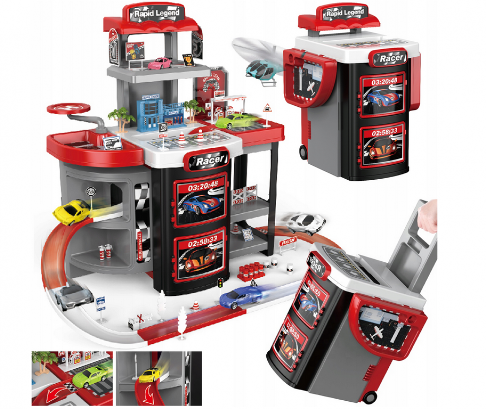Přenosná garáž. 6 aut, vrtulník, autoservis, čerpací stanice, přistávací dráha, dvě parkoviště a zastávka v boxech, dopravní značky, stromy, hasicí přístroje, dráha, kufr na kolečkách