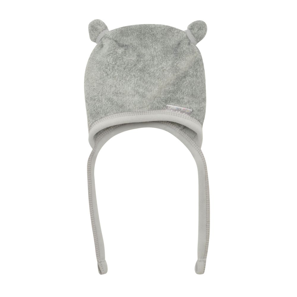 Kojenecká čepička na zavazování oblíbeného a roztomilého střihu s oušky z příjemného hebkého welsoftu.Neutrální šedá barva se hodí pro holčičku i kluka.