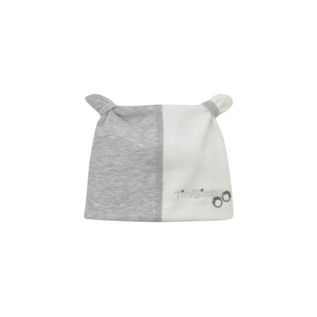 Kojenecká bavlněná čepička s roztomilými oušky v dvojbarevném provedení. Na předním díle detail v podobě výšivky "Tiny Bimbo" s tlapičkami.