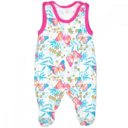 Bavlněné kojenecké dupačky. Dupačky jsou velmi pohodlné, krásné a vhodné pro miminka. Jsou jednobarevné. Klasický design sluší všem malým dětem. Dupačky jsou vyrobeny ze 100% bavlny, jsou příjemné na dotek a jemné k citlivé dětské pokožce. Dupačky v bílé barvě zdobí obrázky motýlků a květů. Chodidla, nohy budou chráněné před chladem, a vzhledem k tomu, že novorozenci neustále sundávají si ponožky, je tento model ideální pro lepší ochranu. Zapínání na ramínkách a mezi nožičkami na baby druky - usnadňuje pohodlné oblékání i přebalování miminka.