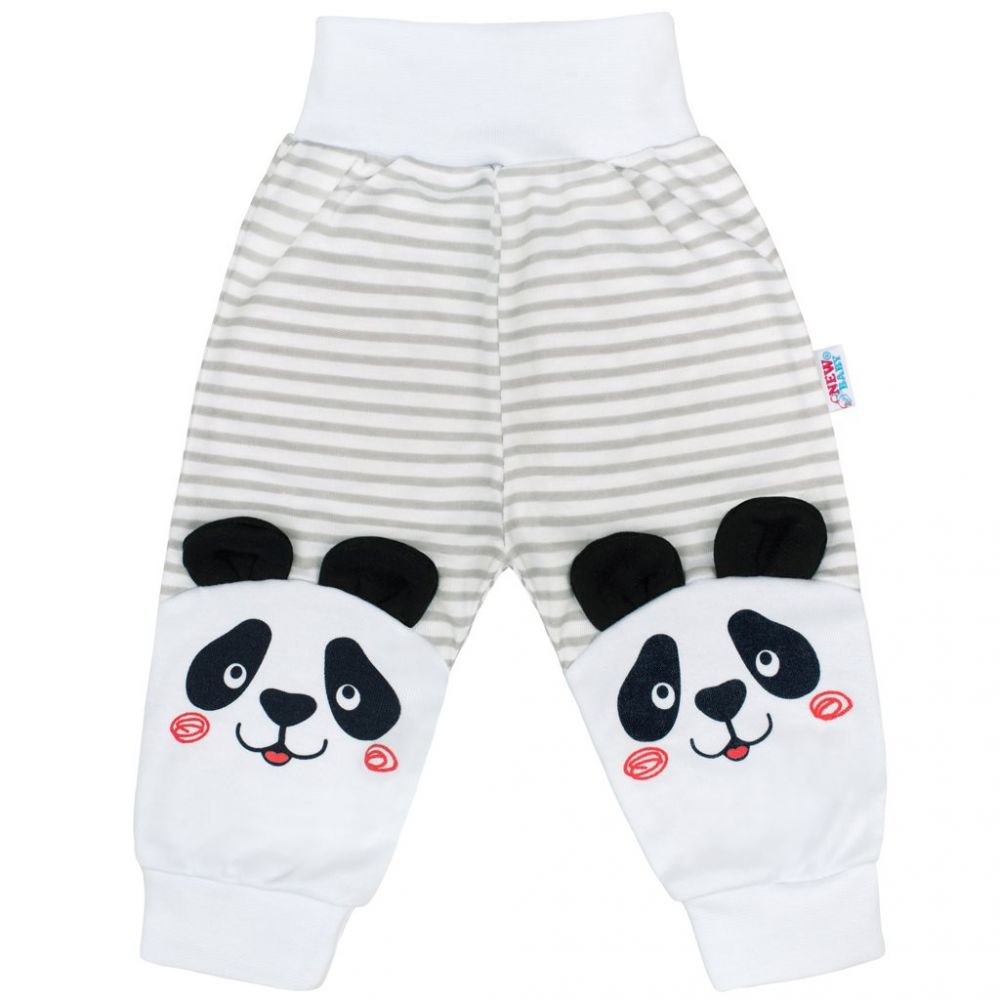 Bavlněné kojenecké tepláčky New Baby Panda pro miminka. Tepláčky jsou proužkované a zdobené obrázkem pandy. V pase mají široký pružný lem. Nohavice jsou také ukončeny širokým pružným lemem. Tepláčky s moderním designem jsou vhodné pro holčičky i chlapečky. Složení: 100% bavlna.