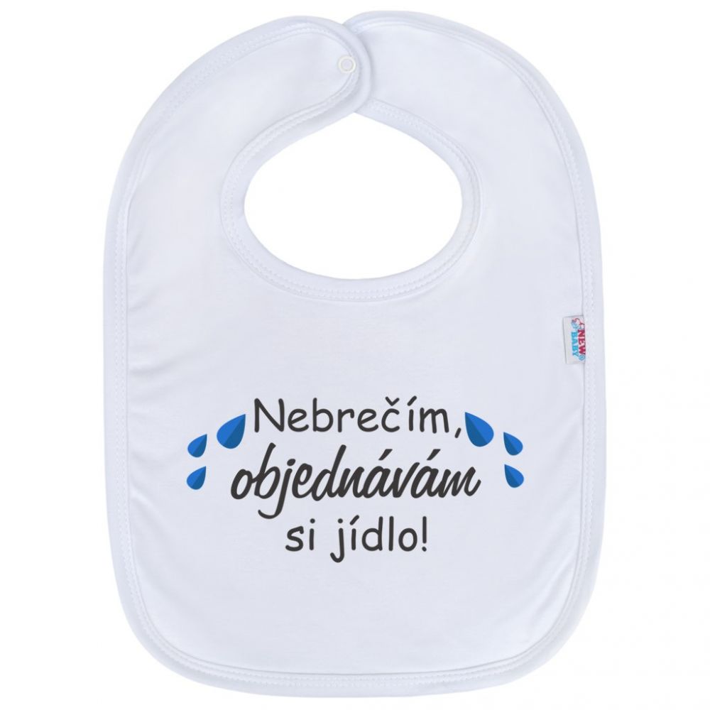 Krásný bavlněný dětský bryndáček s vtipným obrázkem New Baby. Bryndáček je zdoben nápisem Nebrečím objednávám si jídlo! Barvy použité k potisku jsou certifikované a vhodné pro miminka. Je vyroben z příjemného a kvalitního materiálu. Bryndáček má bílé lemování a je vyroben ze dvou vrstev bavlněné látky. Zapínání na cvoček. Dětský bryndáček chrání oblečení miminka před znečištěním při jídle a pití. Složení: 100 % bavlna. Rozměry: dxs cca 36x26 cm.- Produkt české značky