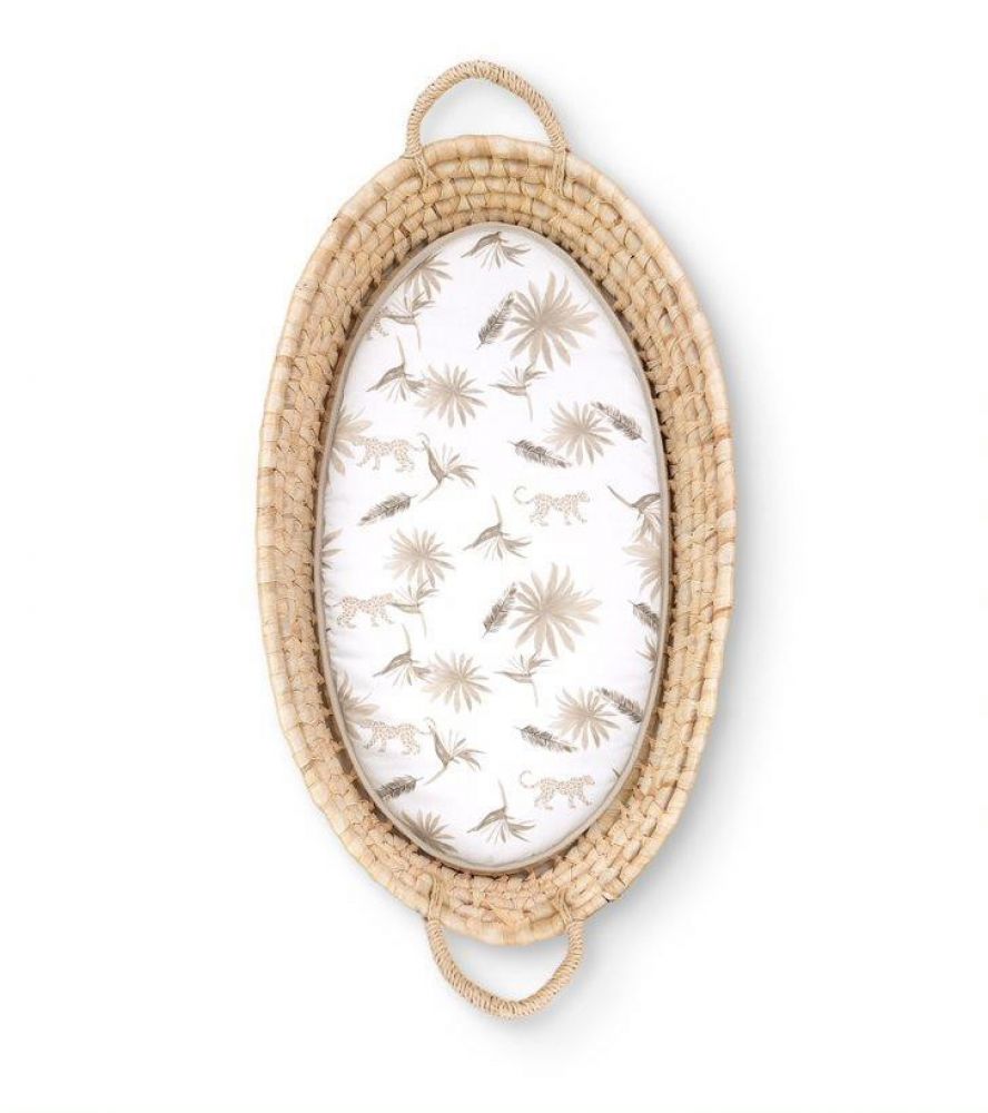 Přebalovací košík s podložkou. Přebalovací košík s podložkou.Přebalovací košík (75x50x12 +/- 2 cm) vyrobený z kukuřičného šustí. Podložka potažená saténem s potiskem (100% bavlna), vyplněna tenkou silikonizovanou netkanou textilií (100% polyester), spodní strana karimatky je vyrobena z bezftalátové fólie. Vše je lemováno bavlněným lemem.Přebalovací košík byl vytvořen s ohledem na elegantní alternativu ke standardnímu přebalovacímu pultu. Je také ideální pro spánek v prvních měsících života (vždy pod dohledem dospělé osoby)