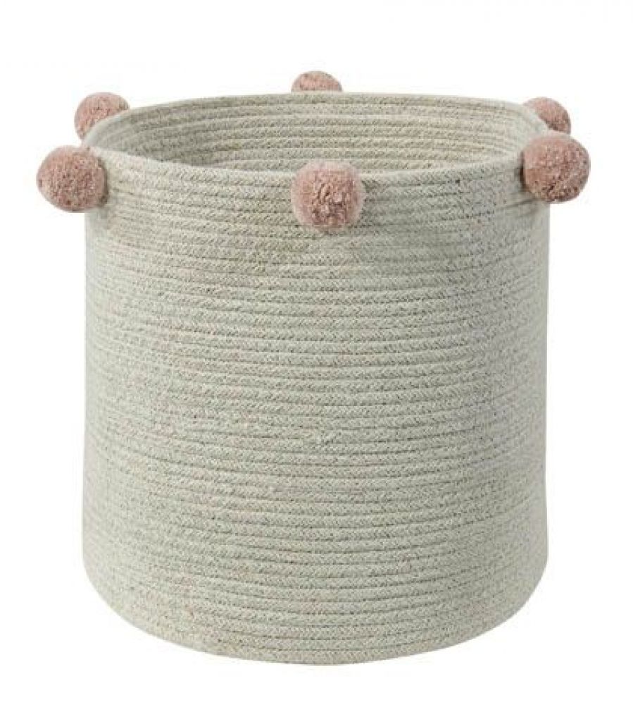 Perfektní do dětských pokojů nebo do jakékoliv jiné místnosti v domě. Košík z pletené bavlny a zdobený 6 bambulkami ve stejné barevné škále, podle barvy, kterou si vyberete. Ručně vyrobené řemeslníky.